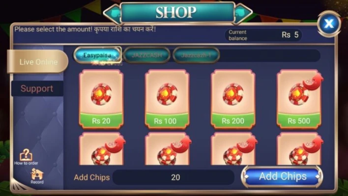 3. Choose the chip amount (starting from as little as 100 PKR).